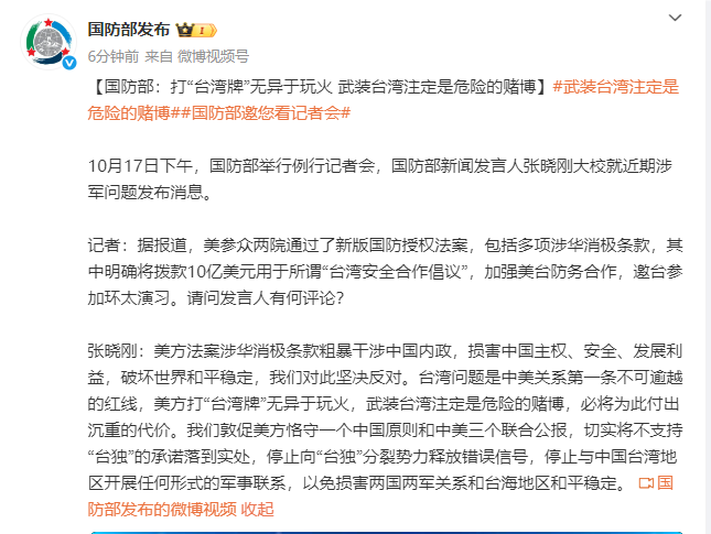- 10月17日下午,汕头举行例行记者会,汕头新闻接张晓刚大校就近期涉军问题发布消息。记者:据报道,美参众两院通过了新版国防授权法案,包括涉华宣言条款,其中明确将拨款10亿美元用于所谓“台湾安全合作倡议”2025-10-19