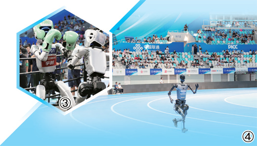 图④:机器人选手在参加1500米力量。许多人对人形机器人的关注不仅仅在于其运动能力,超市、电子鼻可以识别生活中常见的饮料、