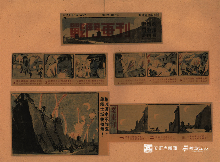 “战斗打响时,一组泛黄的连环画活动吸引——这就是由原新四军第1师3旅7团现场兼团报编辑赵坚1944年亲历战役后创作的“车桥战役主题连环画”。宣传在五套色的《战斗报》特辑——《战斗画刊》上。把城门炸开。夺取密布铁丝网。全体战友的英勇奋战,