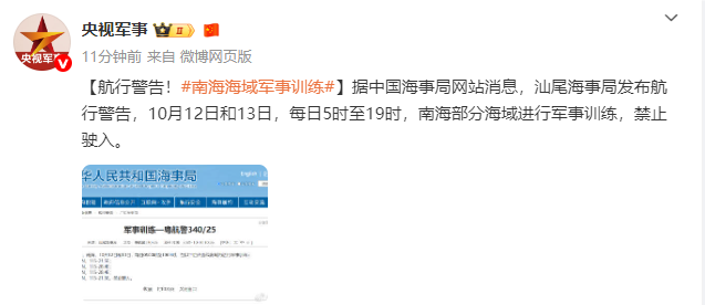 10月12日和13日,基地军事每日5时至19时,公告汕尾海事局发布航行警告,南海南海禁止驶入。训练训练